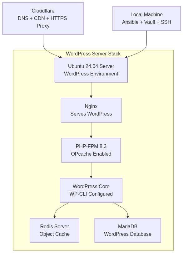 Infrastructure provisioning is fully automated with Ansible playbooks. A single playbook handles all environments by loading environment-specific variables, deploying the full stack (Nginx, PHP, MariaDB, Redis), configuring SSL certificates, and setting up security measures. This reduces deployment time and eliminates manual configuration errors.